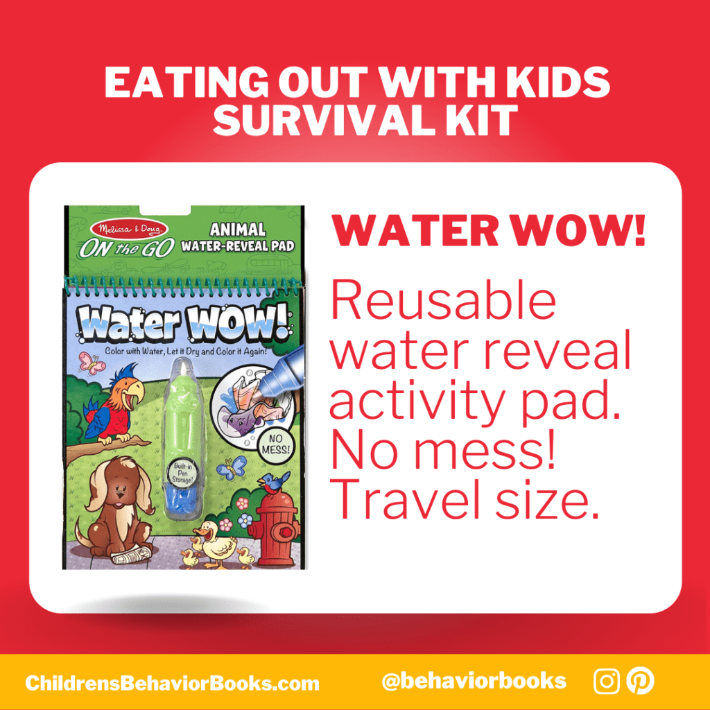 - Water Wow Book. These come in so many varieties. Just fill the pen with water and children “paint” the pictures and colors appear. Even adults have fun doing this. Once they dry the color disappears and waits for your next outing.