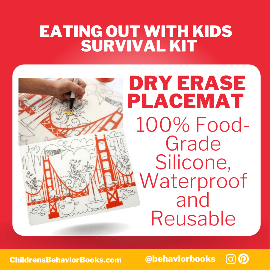 - Dry erase placemat and markers. This is a huge help. I keep it in my bag so the only time they get to play with it is in the restaurant or on a trip. Makes it more exciting and not old hat for them. Also great to put food on instead of a plate that the baby or toddler might accidentally pull to the ground.